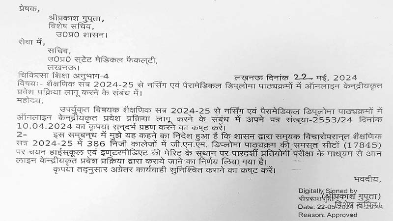जिसमें कहा गया है कि शासन ने सम्यक विचारोपरांत शैक्षणिक सत्र 2024-25 में 386 निजी कॉलेजों में जनरल नर्सिंग एंड मिडवाइफरी (जीएनएम) डिप्लोमा पाठ्यक्रम की समस्त 17845 सीटों पर चयन हाईस्कूल और इंटरमीडिएट की मेरिट के स्थान पर पारदर्शी प्रतियोगी परीक्षा के जरिए ऑनलाइन केंद्रीयकृत प्रवेश परीक्षा द्वारा कराये जाने का निर्णय लिया गया है। इस आदेश के मुताबिक कार्यवाही कराएं।