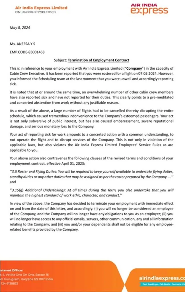 सोशल मीडिया पर वायरल हो रहे इस टर्मिनेशन लेटर में साफ कहा गया है कि काम से ठीक पहले बीमार होने की सूचना देना इस बात की ओर इशारा करता है कि क्रू मेंबर्स फ्लाइट ऑपरेशंस को जानबूझकर बाधित करना चाहते थे, जोकि कानूनों और नियमों के खिलाफ है।