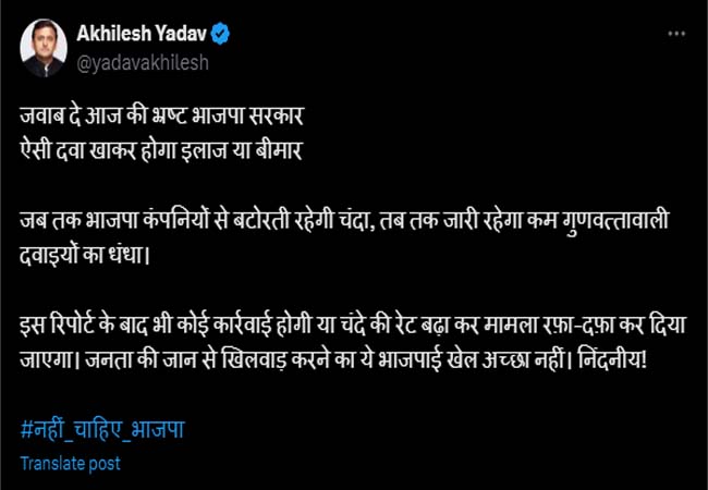 सपा प्रमुख ने कहा कि जब तक भाजपा कंपनियों से बटोरती रहेगी चंदा, तब तक जारी रहेगा कम गुणवत्तावाली दवाइयों का धंधा। उन्होंने इस मामले की निंदा करते हुए आगे लिखा कि इस रिपोर्ट के बाद भी कोई कार्रवाई होगी या चंदे की रेट बढ़ाकर मामला रफ़ा-दफ़ा कर दिया जाएगा। जनता की जान से खिलवाड़ करने का ये भाजपाई खेल अच्छा नहीं है।