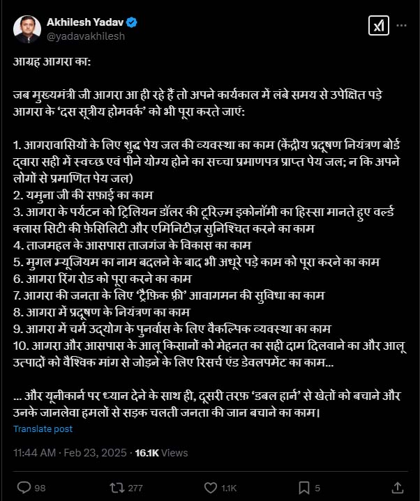 सोशल मीडिया पर अखिलेश यादव ने पोस्ट किया कि आग्रह आगरा का: