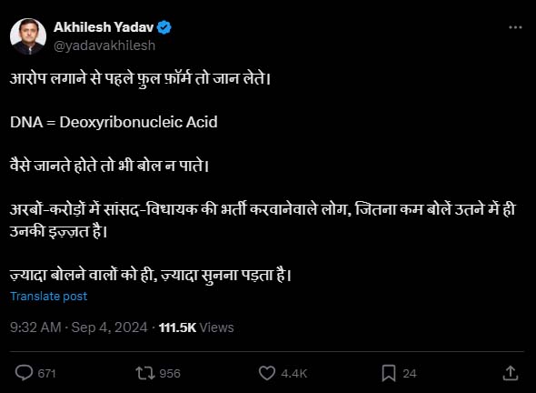 अखिलेश यादव ने ‘एक्स’ पर लिखा कि ‘आरोप लगाने से पहले फुल फ़ॉर्म तो जान लेते। DNA = Deoxyribonucleic Acid वैसे जानते होते तो भी बोल न पाते। अरबों-करोड़ों में सांसद-विधायक की भर्ती करवानेवाले लोग, जितना कम बोलें उतने में ही उनकी इज़्ज़त है’।