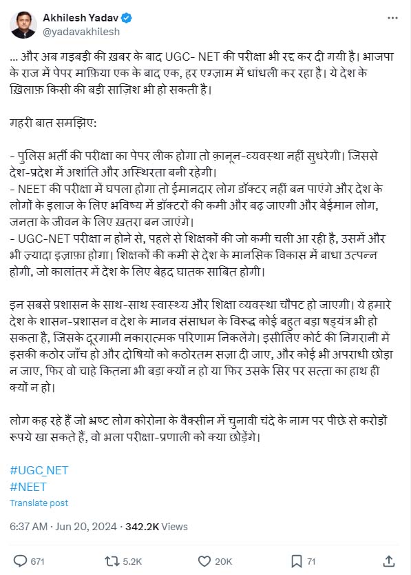 यूजीसी-नेट परीक्षा रद्द मामले में अखिलेश यादव की प्रतिक्रिया, बोले- देश के खिलाफ हो रही बड़ी साजिश