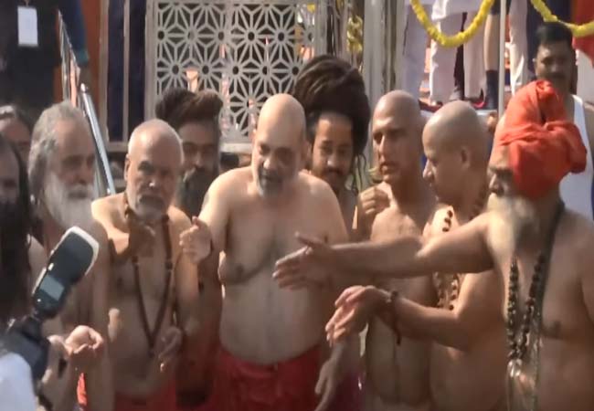 अमित शाह ने संगम में संतों के मंत्रोच्चार के बीच लगाई आस्था की डुबकी, CM योगी रहे मौजूद
