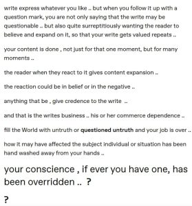 अमिताभ बच्चन ने अपने ब्लॉग में मीडिया की रिपोर्टिंग के तरीकों पर सवाल उठाते हुए लिखा, “कोई भी इंसान कुछ भी व्यक्त करे, लेकिन उसके बाद वह ? लगा देता है तो वह खुद कह देता है कि जो जानकारी संदिग्ध हो सकती है। हालांकि आप यह भी चाहते हैं कि पढ़ने वाला उसपर यकीन करे और उसे आगे बढ़ाए।”