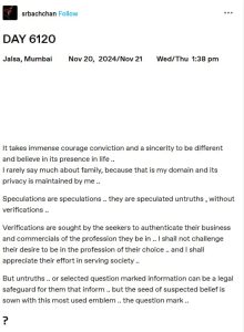 अमिताभ ने इन अफवाहों को ‘झूठी अटकलें’ करार दिया और कहा कि बिना वेरिफिकेशन के ऐसी खबरें फैलाना गलत है। उन्होंने इस बात पर भी जोर दिया कि परिवार की प्राइवेसी बनाए रखना उनकी जिम्मेदारी है।