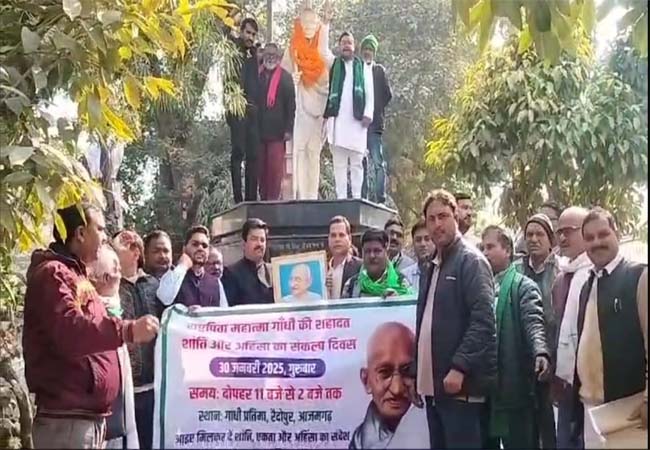 Sandesh Wahak Digital Desk: राष्ट्रपिता महात्मा गांधी के शहादत दिवस (30 जनवरी) के अवसर पर आजमगढ़ नागरिक समाज द्वारा रैदोपुर स्थित गांधी प्रतिमा पर संकल्प सभा का आयोजन किया गया। इस मौके पर उपस्थित लोगों ने गांधीजी को श्रद्धा-सुमन अर्पित करते हुए शांति और अहिंसा का संकल्प लिया।