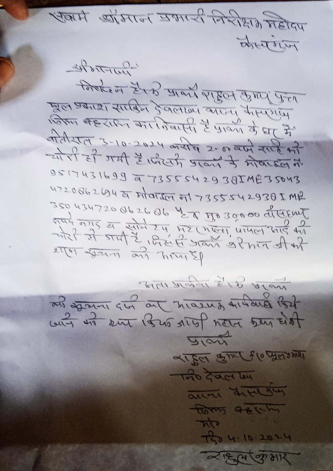 बताया जा रहा है कि इसके बाद सफाई कर्मी राहुल कुमार पुत्र फूल प्रकाश के यहां रात में चोर खिड़की तोड़कर अंदर घुसकर लाखों रुपये के सामान पर हाथ साफ कर दिया। पुलिस को दिए गए प्रार्थना पत्र में 30000 नगद, दो एंड्रॉयड फोन, सोने का टॉपस, मंगलसूत्र पायल आदि जेवर का जिक्र किया गया है। जिसकी कीमत एक लाख रूपये के ऊपर बताई जा रही हैं।