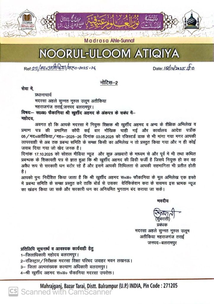 इस नोटिस की प्रतिलिपि जिलाधिकारी बलरामपुर, रजिस्ट्रार/निदेशक मदरसा शिक्षा परिषद लखनऊ और जिला अल्पसंख्यक कल्याण अधिकारी बलरामपुर को भी भेजी गई है, जिससे यह स्पष्ट है कि उच्च स्तर पर भी इस मामले की गंभीरता को समझा जा रहा है।