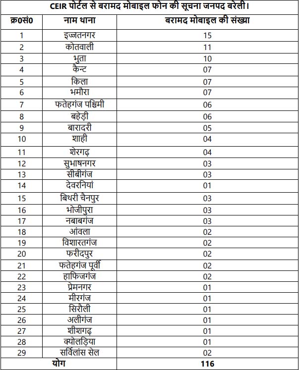 वरिष्ठ पुलिस अधीक्षक, बरेली के निर्देशानुसार थाना पुलिस एवं सर्विलांस टीम ने CEIR (Central Equipment Identity Register) पोर्टल की मदद से इन मोबाइलों की खोजबीन की। संबंधित अपर पुलिस अधीक्षक और क्षेत्राधिकारी के पर्यवेक्षण में कम्प्यूटर ऑपरेटर, सीसीटीएनएस कर्मी और सर्विलांस सेल की संयुक्त कार्रवाई से जनवरी 2025 में कुल 116 मोबाइल फोन बरामद किए गए।
