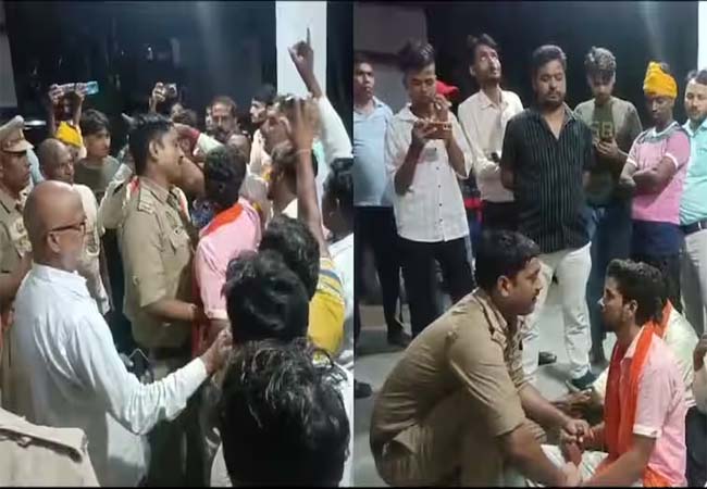 Basti: बजरंग दल के लोगों ने थाने में काटा बवाल, जमीन पर बैठकर मिन्नतें करते रहे दरोगा, देखें VIDEO