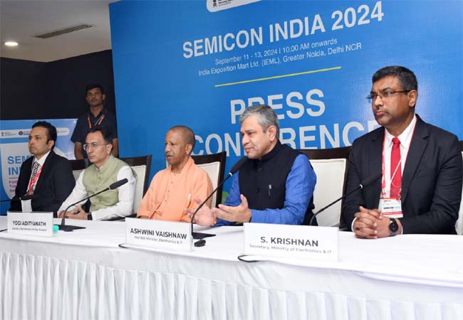 Sandesh Wahak Digital Desk: सेमीकॉन इंडिया 2024 के उद्घाटन के अवसर पर सीएम योगी और केंद्र सरकार के आईटी एंड इलेक्ट्रॉनिक्स मिनिस्टर अश्वनी वैष्णव ने साझा प्रेस कांफ्रेंस को संबोधित किया। इस दौरान सीएम योगी ने उत्तर प्रदेश के बदले हुए परसेप्शन का जिक्र करते हुए कहा कि 2017 के पहले जहां उत्तर प्रदेश में कोई निवेश नहीं करना चाहता था, वहीं आज उत्तर प्रदेश के बदले हुए परसेप्शन के कारण यहां निवेश के ढेर लगे हैं। आज उत्तर प्रदेश में कानून का राज है। निवेश के अनुकूल नीतियां हैं। व्यापार के अनुरूप वातावरण है। इसके चलते आज हर कोई उत्तर प्रदेश में निवेश के लिए आना चाहता है।