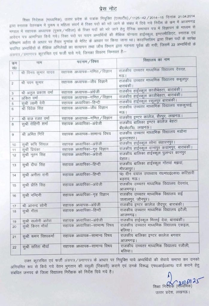इन सभी शिक्षकों की नियुक्ति माध्यमिक विद्यालयों में सहायक अध्यापक के पद पर हुई थी। जांच के दौरान पाया गया कि उन्होंने अपनी नौकरी के लिए फर्जी शैक्षिक दस्तावेजों (मार्कशीट) का इस्तेमाल किया था। इस गंभीर अनियमितता के सामने आने के बाद, माध्यमिक शिक्षा निदेशक ने तुरंत इन सभी शिक्षकों को सेवा से बर्खास्त करने का आदेश जारी कर दिया।