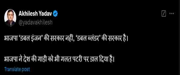 सपा प्रमुख ने सोशल मीडिया मंच ‘एक्स’ पर वंदे भारत ट्रेन की उस खबर को साझा किया जिसमें बताया कि ट्रेन को गोवा जाना था लेकिन वह कल्याण चली गई। उन्होंने पोस्ट में कहा भाजपा डबल इंजन की सरकार नहीं, डबल ब्लंडर की सरकार है। भाजपा ने देश की गाड़ी को भी गलत पटरी पर डाल दिया है।