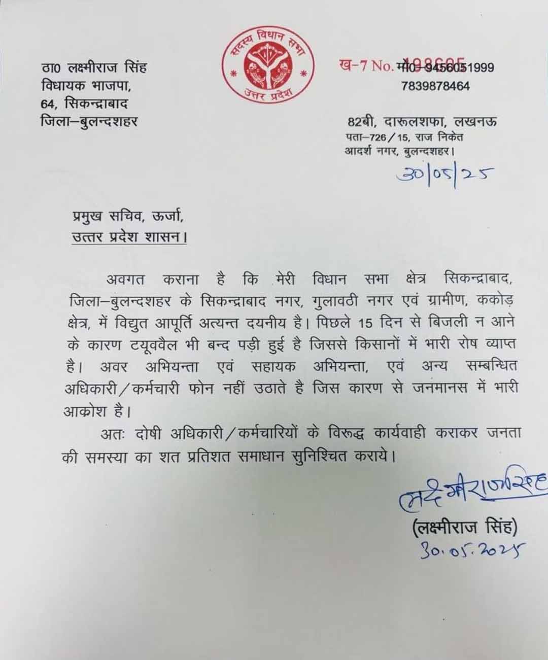 Sandesh Wahak Digital Desk: उत्तर प्रदेश के बुलंदशहर जिले की सिकंदराबाद विधानसभा सीट से भाजपा विधायक लक्ष्मीराज सिंह ने अपनी ही सरकार की कार्यप्रणाली पर सवाल उठाते हुए ऊर्जा विभाग की खामियों को उजागर किया है। विधायक ने राज्य के प्रमुख सचिव (ऊर्जा) को एक पत्र लिखकर क्षेत्र में बिजली की बेहद खराब स्थिति पर चिंता जताई है।