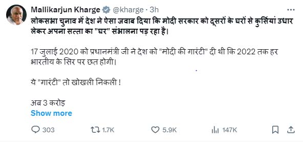खरगे ने कटाक्ष करते हुए ‘एक्स’ पर पोस्ट किया लोकसभा चुनाव में देश ने ऐसा जवाब दिया कि मोदी सरकार को दूसरों के घरों से कुर्सियां उधार लेकर अपना सत्ता का घर संभालना पड़ रहा है। 17 जुलाई 2020 को प्रधानमंत्री जी ने देश को मोदी की गारंटी दी थी कि 2022 तक हर भारतीय के सिर पर छत होगी। ये गारंटी तो खोखली निकली।