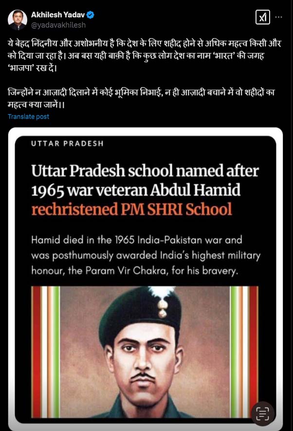 Sandesh Wahak Digital Desk: समाजवादी पार्टी के अध्यक्ष अखिलेश यादव ने मंगलवार को कहा कि गाजीपुर जिले में एक प्राथमिक विद्यालय के प्रवेश द्वार से 1965 के युद्ध के नायक वीर अब्दुल हमीद का नाम हटाया जाना बेहद निंदनीय और अशोभनीय है।
