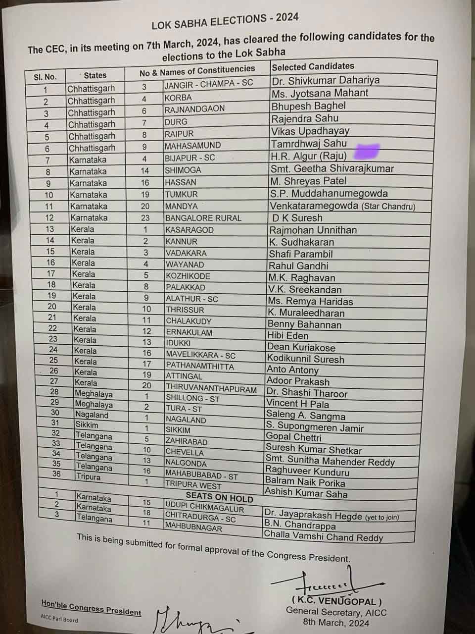कांग्रेस की केंद्रीय चुनाव समिति (सीईसी) ने लोकसभा चुनाव के लिए बृहस्पतिवार को छत्तीसगढ़, केरल और कई अन्य राज्यों में करीब 40 सीट के लिये उम्मीदवारों के नाम पर मुहर लगाई थी।