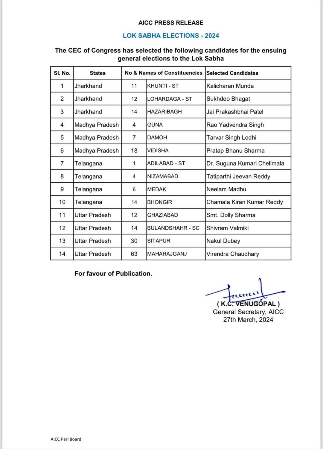 इससे पहले कांग्रेस ने बीते शनिवार (23 मार्च) को यूपी के नौ उम्मीदवारों के नामों की घोषणा की थी। जिसमें पार्टी ने वाराणसी से अजय राय को पीएम मोदी के खिलाफ चुनावी मैदान में उतारा था। इसके अलावा झांसी से प्रदीप जैन को टिकट दिया गया है। इसके अलावा देवरिया से अखिलेश प्रताप सिंह, बाराबंकी से तनुज पुनिया, अमरोहा से दानिश अली, कानपुर से आलोक मिश्र, सहारनपुर से इमरान मसूद, फतेहपुर से रामनाथ शिकरवार और बांसगांव से सदन प्रसाद पर पार्टी ने भरोसा जताया है। बता दें कि इंडिया गठबंधन के तहत कांग्रेस को प्रदेश में 17 सीटे मिली हैं।