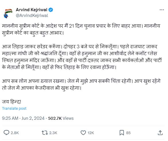 आगे लिखा कि आज तिहाड़ जाकर सरेंडर करूंगा। उससे पहले दोपहर तीन बजे घर से निकलूंगा। पहले राजघाट जाकर महात्मा गांधी जी को श्रद्धांजलि दूंगा। वहां से हनुमान जी का आशीर्वाद लेने कनॉट प्लेस स्थित हनुमान मंदिर जाऊंगा। वहां से पार्टी दफ्तर जाकर सभी कार्यकर्ताओं और पार्टी के नेताओं से मिलूंगा। वहां से फिर तिहाड़ के लिए रवाना हो जाऊंगा। आगे लिखा कि आप सब लोग अपना ख्याल रखना। जेल में मुझे आप सबकी चिंता रहेगी। आप खुश रहेंगे तो जेल में आपका केजरीवाल भी खुश रहेगा। जय हिन्द!