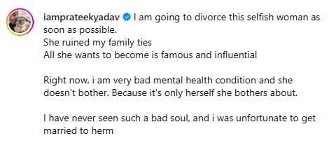 अपनी पोस्ट में प्रतीक ने अपना दर्द साझा करते हुए लिखा “मैं इस मतलबी औरत से बहुत जल्द तलाक लेने जा रहा हूँ। उसने मेरे परिवार के सभी रिश्तों को बर्बाद कर दिया है। उसे सिर्फ मशहूर होने और पावरफुल बनने की भूख है।”