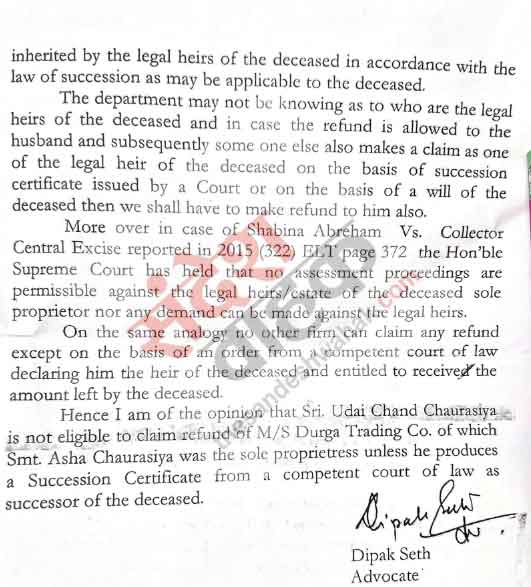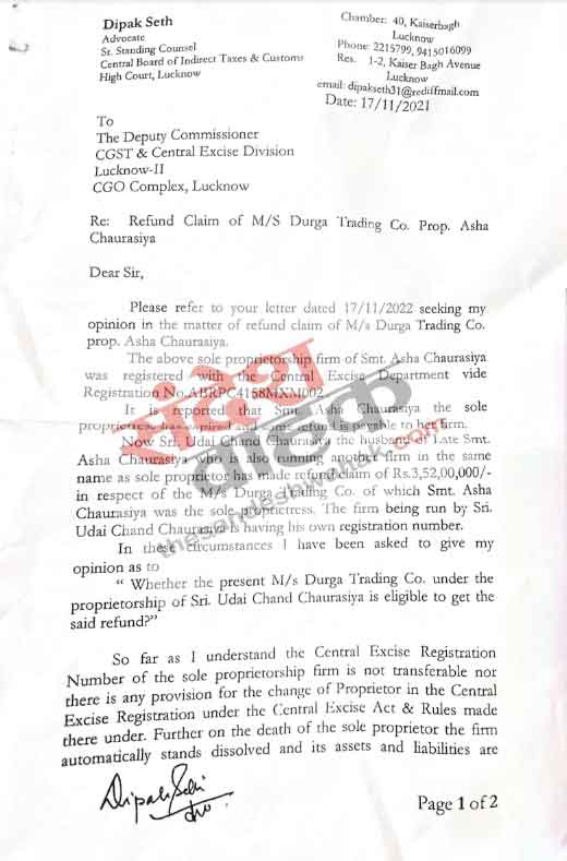 दरअसल लखनऊ की प्रोपराइटर फर्म दुर्गा ट्रेडिंग की मालिक आशा चौरसिया की मृत्यु 2019 में हो गयी थी। इसके बावजूद इस फर्म के मामले की सुनवाई अफसरों ने जारी रखी। फर्म की दिवंगत प्रोपराइटर के पति उदय चंद चौरसिया ने 23 अगस्त 2022 को दुर्गा ट्रेडिंग के रिफंड वापसी का आवेदन सीजीएसटी अफसरों को दिया था। तत्कालीन प्रधान आयुक्त संजय राठी द्वारा पारित आदेश 07/पीसी/2022-23 दिनांक 01.06.2022 में शुल्क की मांग को रद्द करने के बाद तीन करोड़ 52 लाख का रिफंड ब्याज सहित फर्म की दिवंगत प्रोपराइटर के पति उदय चौरासिया के द्वारा विभाग से मांगा गया था।