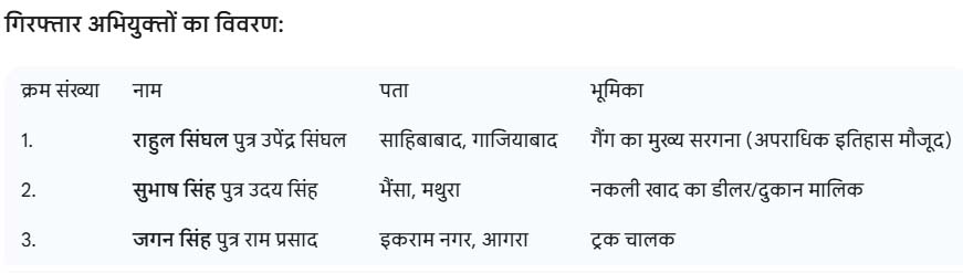 जगन सिंह की निशानदेही पर एग्रो जंक्शन केंद्र के मालिक सुभाष सिंह (निवासी भैंसा, मथुरा) को भी गिरफ्तार किया गया, जिसने बताया कि उसने यह नकली खाद गैंग के सरगना राहुल सिंघल से खरीदी थी।