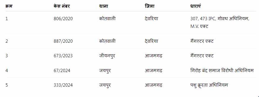 तैयब के खिलाफ देवरिया और आजमगढ़ में कई गंभीर धाराओं में मामले दर्ज हैं। इनमें हत्या की कोशिश, गैंगस्टर एक्ट, गोकशी अधिनियम और मोटर वाहन अधिनियम की धाराएं शामिल हैं। उसके खिलाफ दर्ज प्रमुख मामले इस प्रकार हैं: