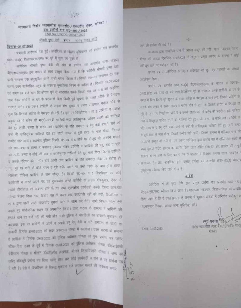 विशेष न्यायाधीश एससी/एसटी एक्ट, गोण्डा द्वारा आदेश दिया गया कि आवेदिका पुष्पा देवी द्वारा प्रस्तुत प्रार्थना पत्र अंतर्गत धारा -173(4) बीएनएसएस स्वीकार किया जाता है। थानाध्यक्ष नवाबगंज, जिला गोण्डा को आदेशित किया जाता है कि वे उक्त प्रकरण के संबंध में सुसंगत धाराओं में अभियोग पंजीकृत कर नियमानुसार विवेचना कराया जाना सुनिश्चित करें। कोर्ट द्वारा 31 जुलाई को दिए गए आदेश को 28 दिन हो गए लेकिन अभी तक आरोपियों के खिलाफ अभियोग पंजीकृत नहीं किया गया। ऐसे में यह स्पष्ट होता है कि नवाबगंज थानाध्यक्ष अभय सिंह के लिए अदालत का आदेश भी कोई मायने नहीं रखता!