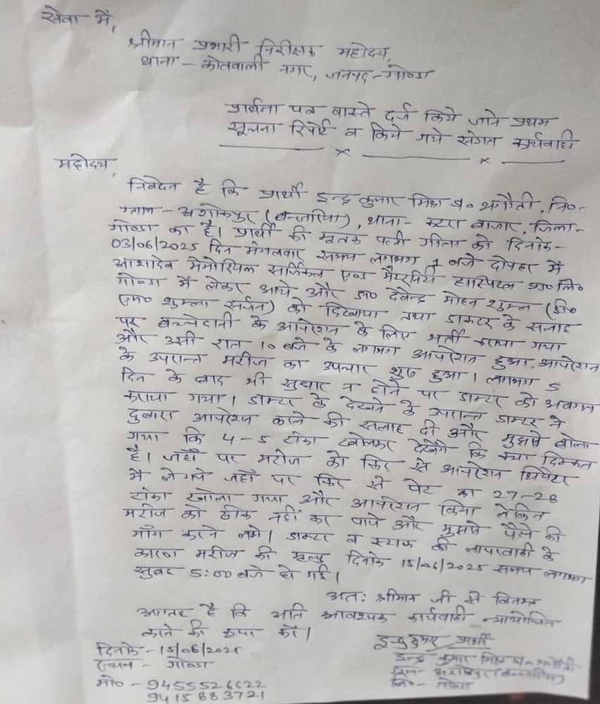 इस संबंध में इंद्रकुमार मिश्र पुत्र भगौती मिश्रा निवासी ग्राम अशोकपुर बंजरिया, थाना कटरा बाजार द्वारा नगर कोतवाली में तहरीर दी गयी, जिसमें कहा गया कि उसने अपनी पत्नी गीता को दिनांक 03.06.2025 को दोपहर करीब 01 बजे आशादेव मेमोरियल सर्जिकल एंड मैटरनिटी हॉस्पिटल, गोण्डा लेकर आया था और डॉ देवेन्द्र मोहन शुक्ल को दिखाया। डॉक्टर की सलाह पर बच्चेदानी के ऑपरेशन के लिए आशादेव हॉस्पिटल में भर्ती करा दिया। उसी रात करीब 10 बजे ऑपरेशन हुआ। इसके बाद मरीज का उपचार शुरू किया गया। लगभग पांच दिन बाद भी सुधार न होने पर डॉक्टर को बताया गया। इस पर मरीज को देखने के बाद डॉक्टर ने दोबारा आपरेशन की सलाह दी।