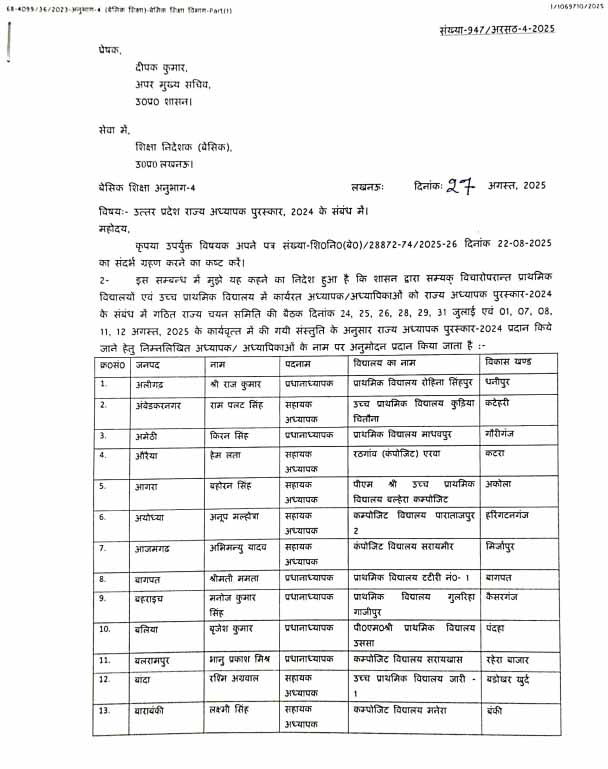 उत्कृष्ट कार्यों के लिए शिक्षक दिवस पर 5 सितंबर को मुख्यमंत्री योगी आदित्यनाथ करेंगे सम्मानित