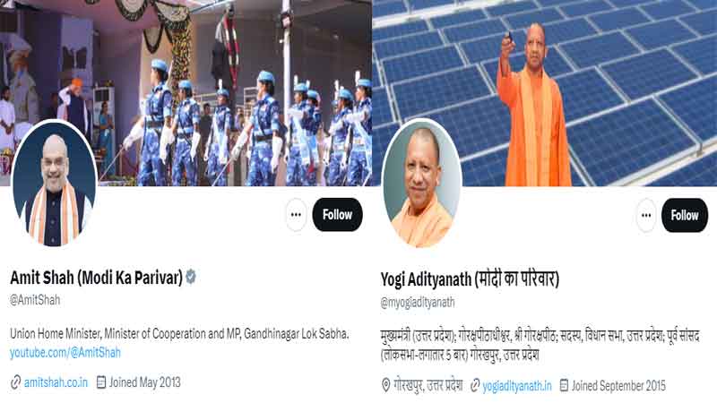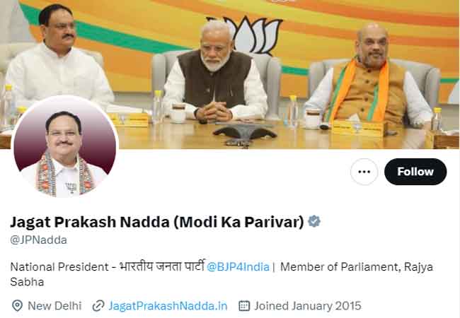 सबसे पहले भाजपा अध्यक्ष नड्डा ने अपने प्रोफाइल में यह बदलाव किया और उसके बाद गृह मंत्री शाह ने। कुछ देर बाद केंद्रीय मंत्री राजनाथ सिंह, नितिन गडकरी, अश्विनी वैष्णव और अनुराग ठाकुर ने भी इसका अनुसरण करते हुए ‘एक्स’ प्रोफाइल पर अपने नाम के आगे ‘मोदी का परिवार’ जोड़ दिया।
