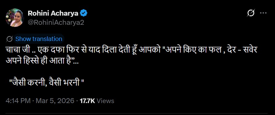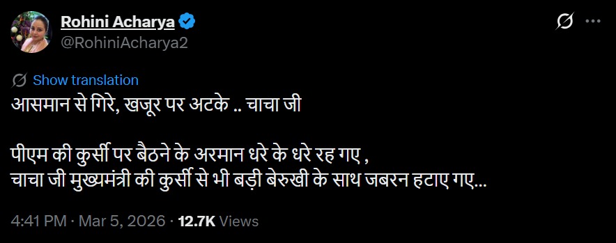 रोहिणी ने अपने पोस्ट में यह भी दावा किया कि नीतीश कुमार को किनारे लगाने के लिए ऑपरेशन लोटस’ की स्क्रिप्ट तो भाजपा ने लिखी, लेकिन इसे अंजाम नीतीश जी के ही कुछ बेहद करीबियों ने पहनाया। उन्होंने कहा कि बीजेपी ने उन्हें ऐसा करने पर मजबूर किया है और उनके करीबियों ने ही उन्हें गर्त में धकेलने में साथ दिया।