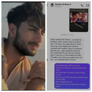 पाकिस्तानी क्रिटिक द्वारा शेयर किए गए स्क्रीनशॉट के अनुसार, इब्राहिम ने बेहद तीखे शब्दों में जवाब दिया। उन्होंने लिखा- “तमूर लगभग तैमूर जैसा, तुम्हें मेरे भाई का नाम मिला। अंदाजा लगाओ कि तुम्हें क्या नहीं मिला? उसका चेहरा। तुम बदसूरत कूड़े के टुकड़े हो। चूंकि तुम अपने शब्दों को अपने तक नहीं रख सकते, इसलिए परेशान मत हो, वे तुम्हारी तरह ही अप्रासंगिक हैं। बदसूरत, बकवास, मुझे तुम्हारे और तुम्हारे परिवार के लिए बुरा लग रहा है और अगर मैं तुम्हें एक दिन सड़कों पर देखूंगा, तो मैं तुम्हें तुमसे भी बदसूरत बनाकर छोड़ूंगा – तुम चलते-फिरते कूड़े के टुकड़े हो।”