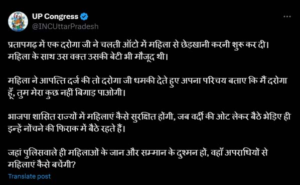इस बीच उप्र कांग्रेस के सोशल मीडिया मंच एक्स के आधिकारिक खाते पर एक पोस्ट में कहा गया कि प्रतापगढ़ में एक दरोगा जी ने चलती ऑटो में महिला से छेड़खानी करनी शुरू कर दी। महिला के साथ उस वक़्त उसकी बेटी भी मौजूद थी। महिला ने आपत्ति दर्ज की तो दरोगा जी धमकी देते हुए अपना परिचय बताए कि मैं दरोगा हूँ, तुम मेरा कुछ नहीं बिगाड़ पाओगी।