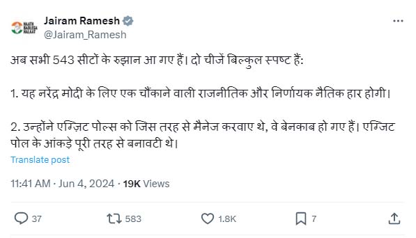 पार्टी महासचिव जयराम रमेश ने ‘एक्स’ पर पोस्ट किया अब सभी 543 सीटों के रुझान आ गए हैं। दो चीजें बिल्कुल स्पष्ट हैं। पहली यह कि यह नरेन्द्र मोदी के लिए एक चौंकाने वाली राजनीतिक और निर्णायक नैतिक हार होगी।