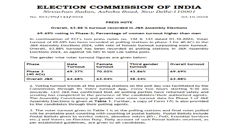 Jammu-Kashmir Election : हाल ही में संपन्न हुए जम्मू-कश्मीर विधानसभा चुनावों के नतीजे 8 अक्टूबर को आएंगे। वहीँ गुरुवार को चुनाव आयोग ने चुनाव को लेकर हुए मतदान के आंकड़े जारी कर दिए हैं। आयोग के मुताबिक, विधानसभा चुनाव के तीनों चरणों में कुल 63.88 प्रतिशत मतदान रिकॉर्ड किया गया। अंतिम और तीसरे चरण की वोटिंग में 69.69 प्रतिशत मतदान हुआ।