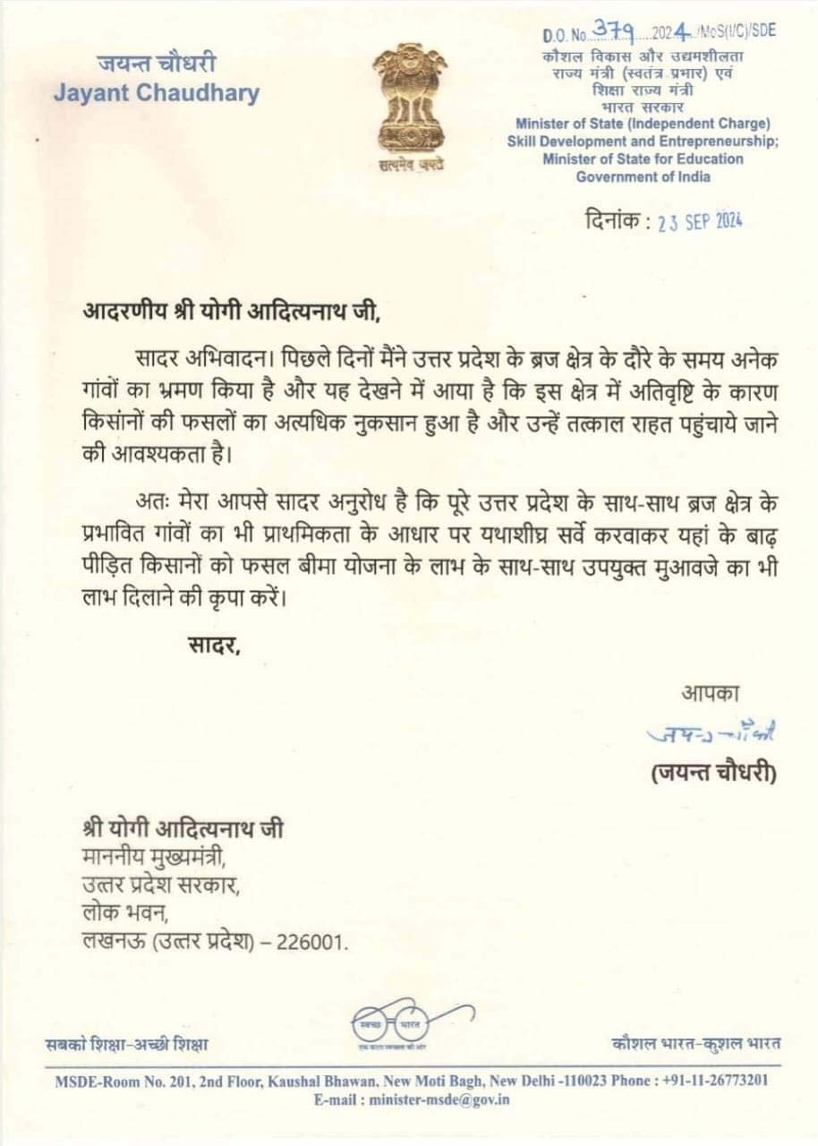Sandesh Wahak Digital Desk: केन्द्रीय कौशल विकास और उद्यमशीलता राज्यमंत्री (स्वतंत्र प्रभार) व सत्तारूढ़ भाजपा नीत राष्ट्रीय जनतांत्रिक गठबंधन के घटक दल राष्ट्रीय लोकदल के प्रमुख जयंत चौधरी ने मुख्यमंत्री योगी आदित्यनाथ को पत्र लिखकर बाढ़ और अतिवृष्टि से पीड़ित ब्रज क्षेत्र के किसानों को फसल बीमा योजना के लाभ के साथ मुआवजा देने का अनुरोध किया है।