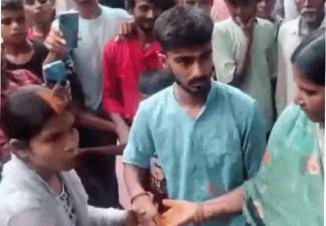 Sandesh Wahak Digital Desk: कुशीनगर जिले के हाटा कोतवाली क्षेत्र के रामपुर सोहरौना स्थित मंझरिया देवी मंदिर में एक हैरान कर देने वाली घटना सामने आई है, जहां युवती ने अपने प्रेमी युवक से जबरन सिंदूर डलवाकर उसे अपनी पत्नी बना लिया। इस घटना का वीडियो सोशल मीडिया पर मंगलवार को वायरल हुआ, और जल्द ही यह चर्चा का विषय बन गया।
