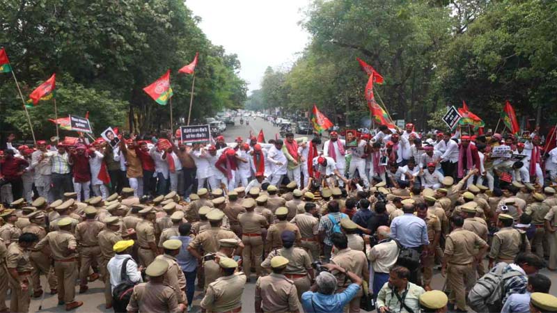 सपा की युवा शाखा के कार्यकर्ताओं ने लखनऊ स्थित पार्टी मुख्यालय से नारेबाजी करते हुए विक्रमादित्य मार्ग तक विरोध मार्च निकाला, जहां वह पुलिस के लगाए गए अवरोधकों पर चढ़ गए। वीडियो में प्रदर्शनकारी पुलिस अवरोधकों पर चढ़ते और उससे कूदते नजर आ रहे हैं।