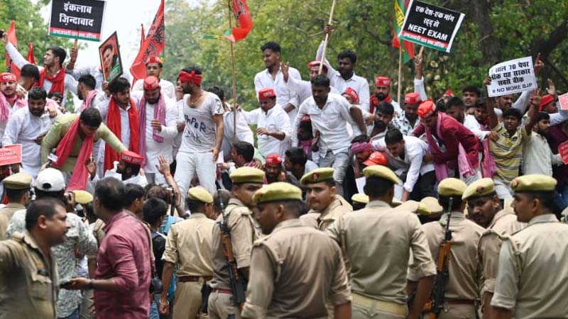 पुलिस ने प्रदर्शनकारियों को तितर-बितर करने के लिए हल्का लाठीचार्ज किया और कुछ प्रदर्शनकारियों को हिरासत में लेकर प्रदर्शन स्थल से दूर छोड़ दिया। सपा प्रमुख अखिलेश यादव और उनकी पार्टी राज्य में नीट के साथ-साथ पुलिस भर्ती परीक्षा के प्रश्नपत्र लीक होने का मुद्दा जोर-शोर से उठा रही है।