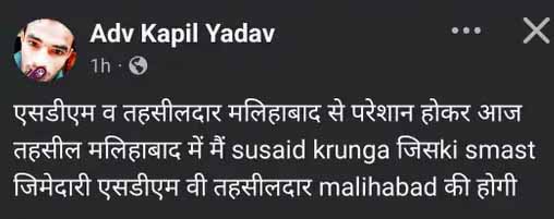 मामला तब और गंभीर हो गया जब शनिवार सुबह एक वकील कपिल यादव ने सोशल मीडिया पर तहसील परिसर में आत्महत्या करने की धमकी देते हुए तहसीलदार और एसडीएम पर गंभीर आरोप लगाए। उन्होंने कहा कि यदि उन्हें कुछ होता है तो इसके जिम्मेदार प्रशासनिक अधिकारी होंगे।