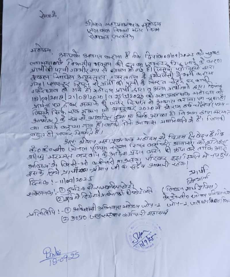यह घटना बीते 8 सितंबर 2025 (सोमवार) सुबह 11 बजे के आसपास हुई। जल संस्थान के ज़ोन-1 में तैनात गैंगमैन लिण्डन ईनस ने बताया कि वह अपने परिवार के साथ इन्हीं जर्जर क्वार्टरों में रहते हैं। सोमवार को उनकी पत्नी संतोष घर में थीं, तभी अचानक छत का प्लास्टर गिर गया, जिससे उनके चेहरे पर गंभीर चोटें आईं।
