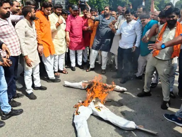 लखनऊ में भाजपा ने फूंका अखिलेश यादव का पुतला, तस्वीर पर पहनाई जूते-चप्पल की माला