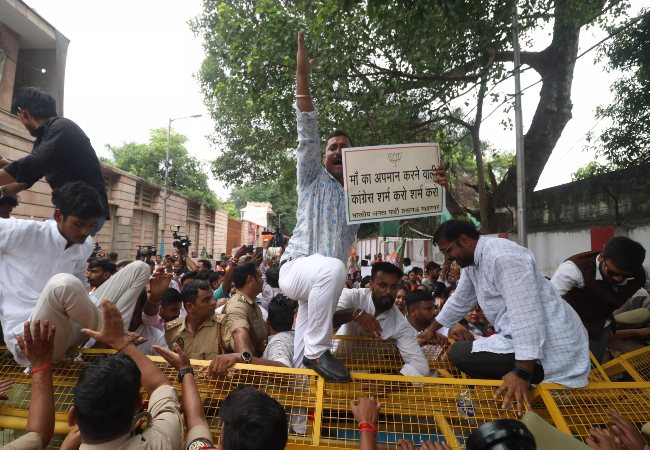 बीजेपी कार्यकर्ताओं ने कांग्रेस के खिलाफ नारेबाजी की और ‘योगी-मोदी जिंदाबाद’ के नारे लगाए। बड़ी संख्या में महिला मोर्चा की पदाधिकारी और कार्यकर्ता कांग्रेस कार्यालय की तरफ बढ़ने लगे, लेकिन पुलिस ने बीच रास्ते में ही बैरिकेडिंग लगाकर उन्हें रोक दिया। इस दौरान पुलिस और कार्यकर्ताओं के बीच धक्का-मुक्की हुई।