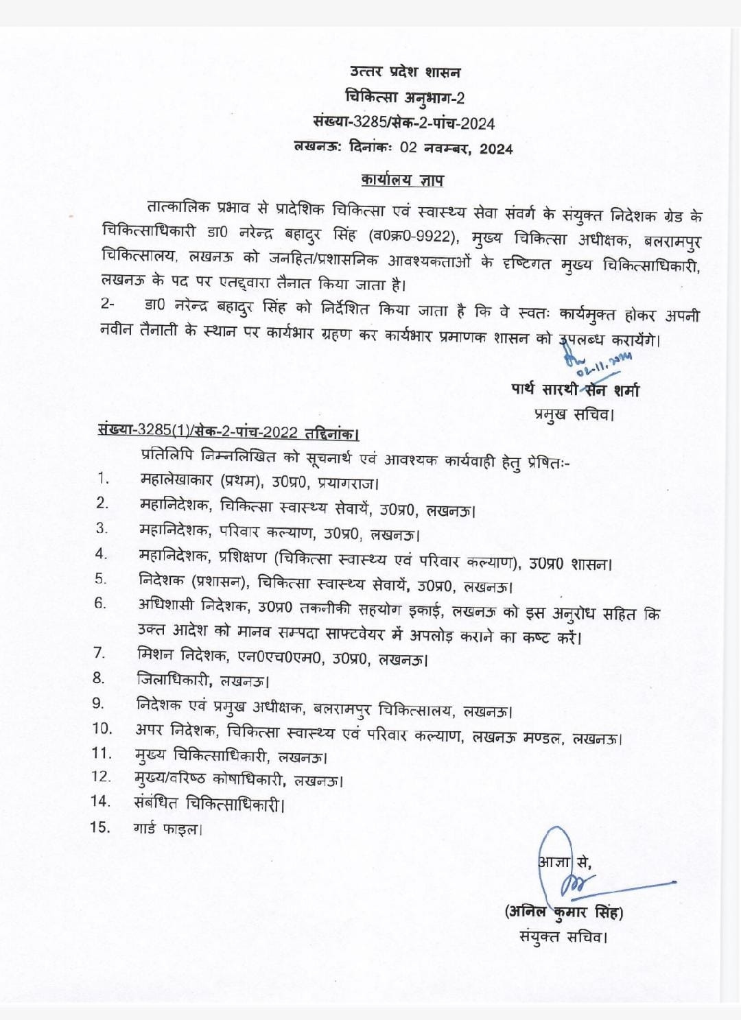 Lucknow News : डॉक्टर नरेंद्र बहादुर सिंह बने लखनऊ के नए सीएमओ