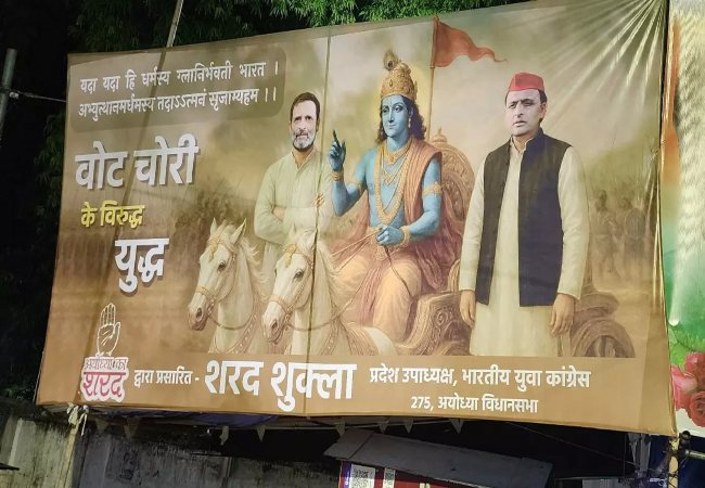 Lucknow News: लखनऊ में लगा ‘वोट चोरी के विरुद्ध युद्ध’ का पोस्टर, राहुल-अखिलेश को दिखाया गया श्रीकृष्ण के रथ पर