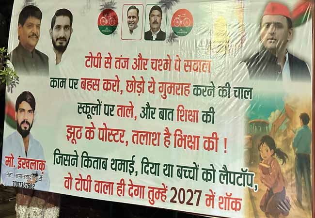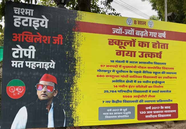 भाजपा की ओर से लगाए गए एक पोस्टर में लिखा गया “चश्मा हटाइए अखिलेश जी, टोपी मत पहनाइए।”