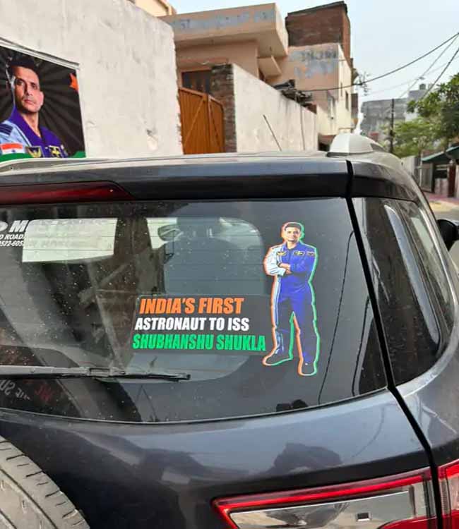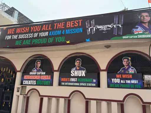 शुभांशु के घर के बाहर लगी 20 फीट ऊंची होर्डिंग में उनका अंतरिक्ष सूट पहने शानदार चित्र दिखाई दे रहा है। थीम को पूरी तरह से देशभक्ति और एयरफोर्स से जोड़ा गया है। तिरंगे के तीन रंगों में संदेश लिखा है—