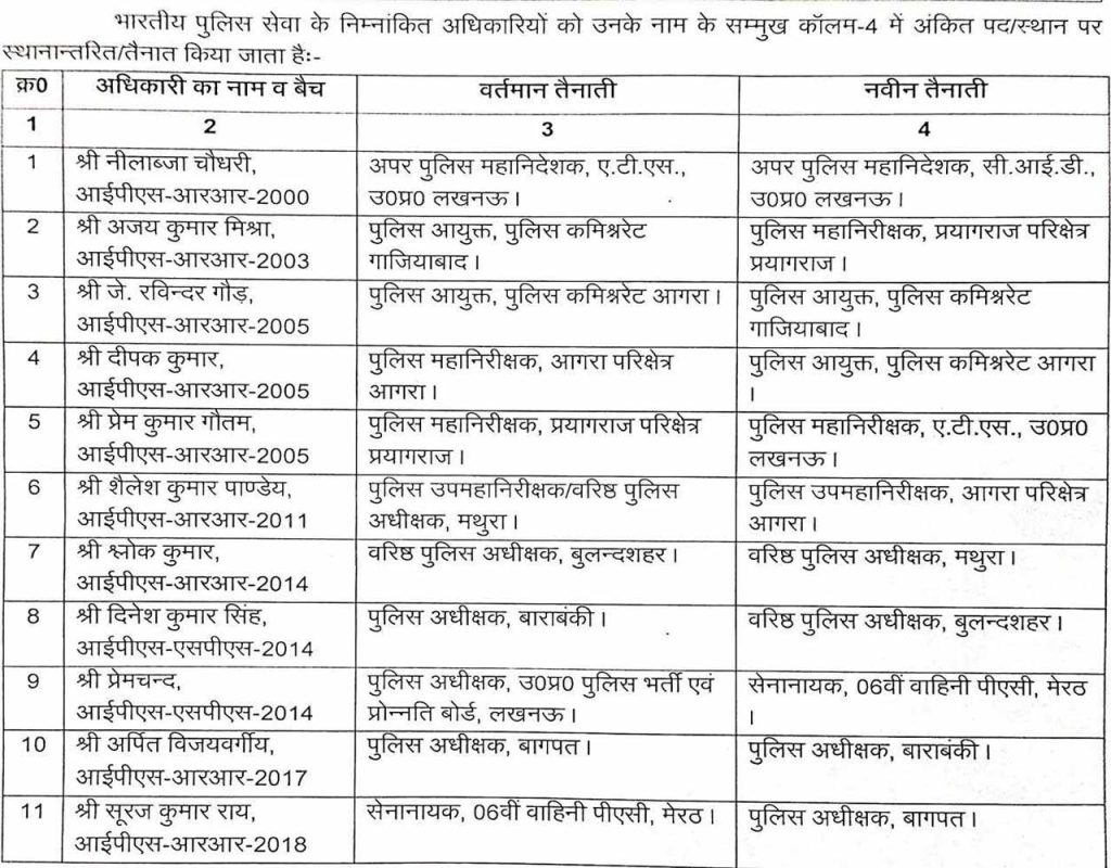 Sandesh Wahak Digital Desk: उत्तर प्रदेश की योगी आदित्यनाथ सरकार ने मंगलवार देर रात पुलिस प्रशासन में बड़ा फेरबदल करते हुए 11 आईपीएस अधिकारियों के तबादले किए हैं। इस क्रम में गाजियाबाद और आगरा के पुलिस कमिश्नर बदले गए हैं, वहीं मथुरा, बुलंदशहर, बाराबंकी और बागपत में नए पुलिस कप्तानों की तैनाती की गई है।