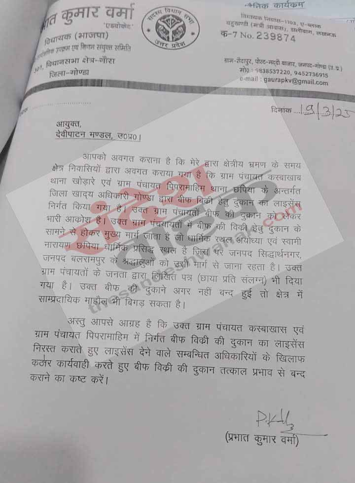 पत्र में लिखा गया है कि “उनके द्वारा क्षेत्र भ्रमण के समय लोगों द्वारा अवगत कराया गया है कि ग्राम पंचायत कस्बा खास थाना खोड़ारे एवं ग्राम पंचायत पिपरा माहिम थाना छपिया के अंतर्गत जिला खाद्य अधिकारी गोण्डा द्वारा बीफ बिक्री हेतु दुकान का लाइसेंस निर्गत किया गया है। उक्त ग्राम पंचायतों में बीफ की दुकान को लेकर भारी आक्रोश है। विधायक ने लिखा कि उक्त बीफ की दुकानें यदि नहीं बंद हुईं तो क्षेत्र में साम्प्रदायिक माहौल भी बिगड़ सकता है।” (हालांकि वायरल पत्र की पुष्टि संदेश वाहक नहीं करता है)।